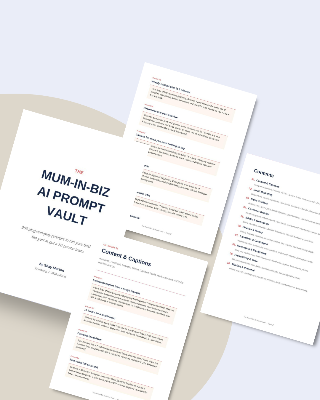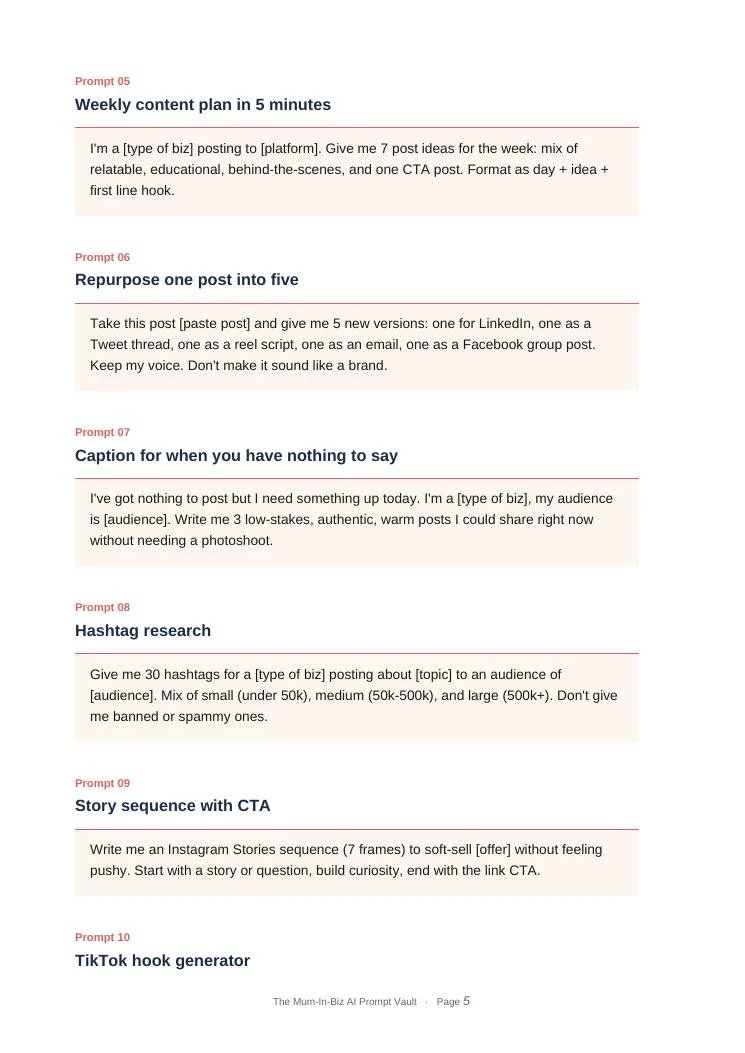Mindset & Personal (20 prompts): Imposter syndrome, decision-making, comparison spirals, permission slips, mum-in-biz identity
